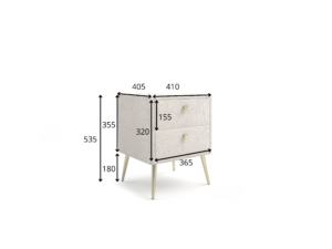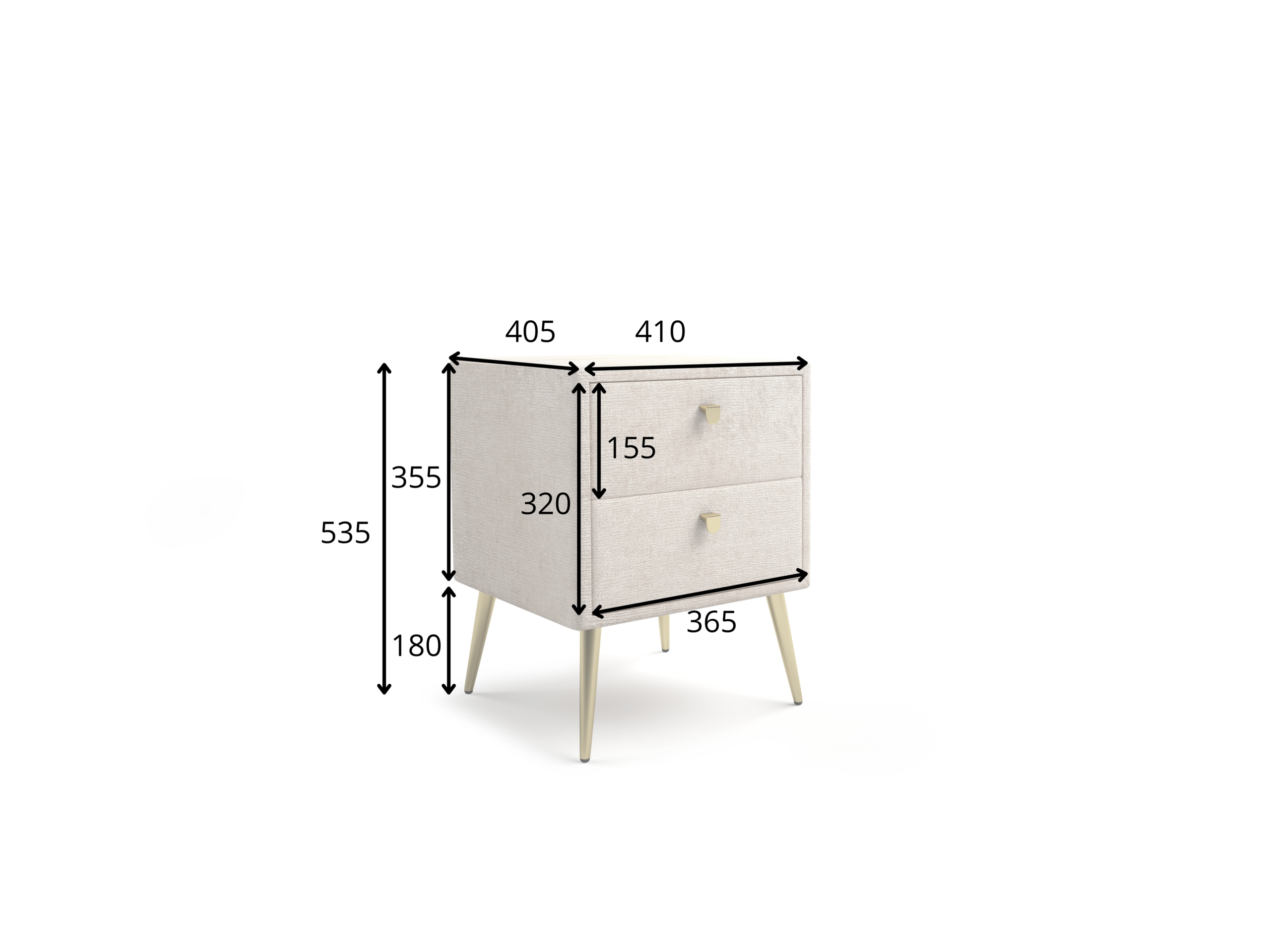 Model wyposażony jest w dwie praktyczne szuflady, które zapewniają wygodne miejsce do przechowywania najpotrzebniejszych przedmiotów – od książek po drobne akcesoria codziennego użytku. Złote nogi oraz dopasowane uchwyty nadają meblowi wyjątkowego charakteru, podkreślając jego ekskluzywny wygląd i wprowadzając do wnętrza odrobinę blasku.